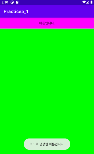 Toast.makeText(getApplicationContext(), "코드로 생성한 버튼입니다.",