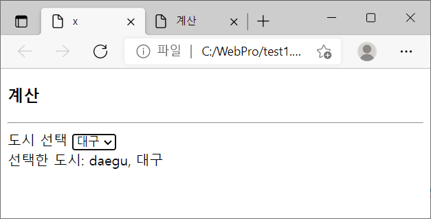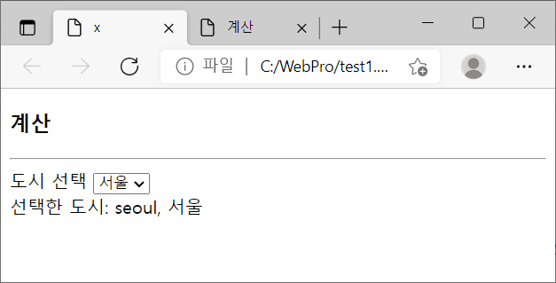 <div>선택한 도시: <span id="result">seoul, 서울</span></div>