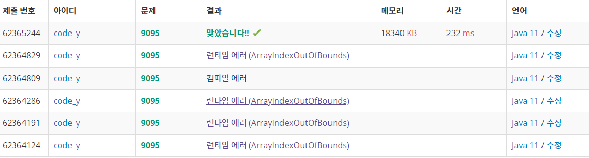 점화식을 도출해내는데 얼마 안 걸렸는데, 여러 번 런타임 에러가 떴다.